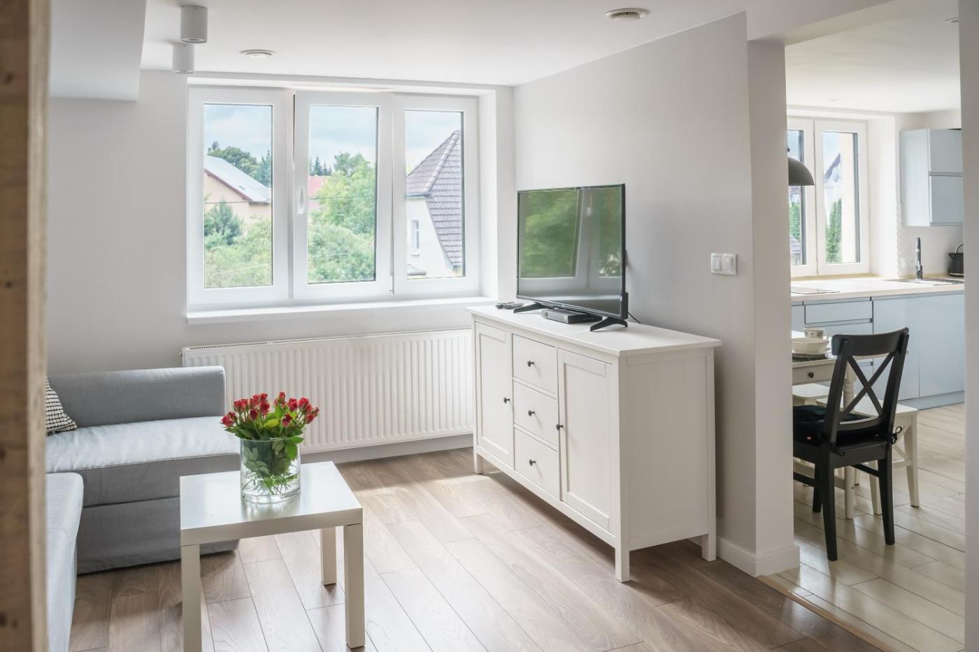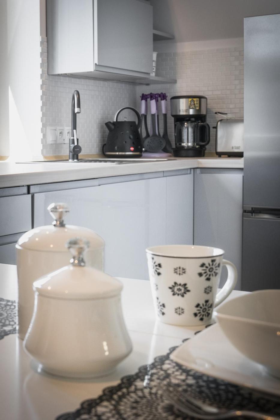 Apartament dwupoziomowy. This apartment is comprised of 2 living rooms, 1 separate bedroom and 1 bathroom with a shower and a hairdryer. Guests can make meals in the kitchen that is fitted with a stovetop, a refrigerator, a dishwasher and kitchenware. The apartment offers a coffee machine, a dining area, a wardrobe, a flat-screen TV with cable channels, as well as garden views. The unit offers 2 beds. Apartament - 4 osobowy. Powierzchnia pokoju ok.: 55 mkw.