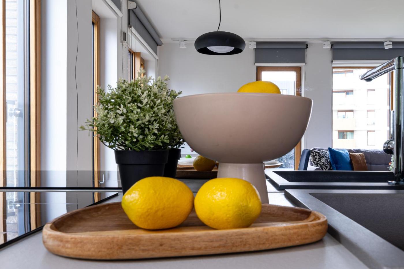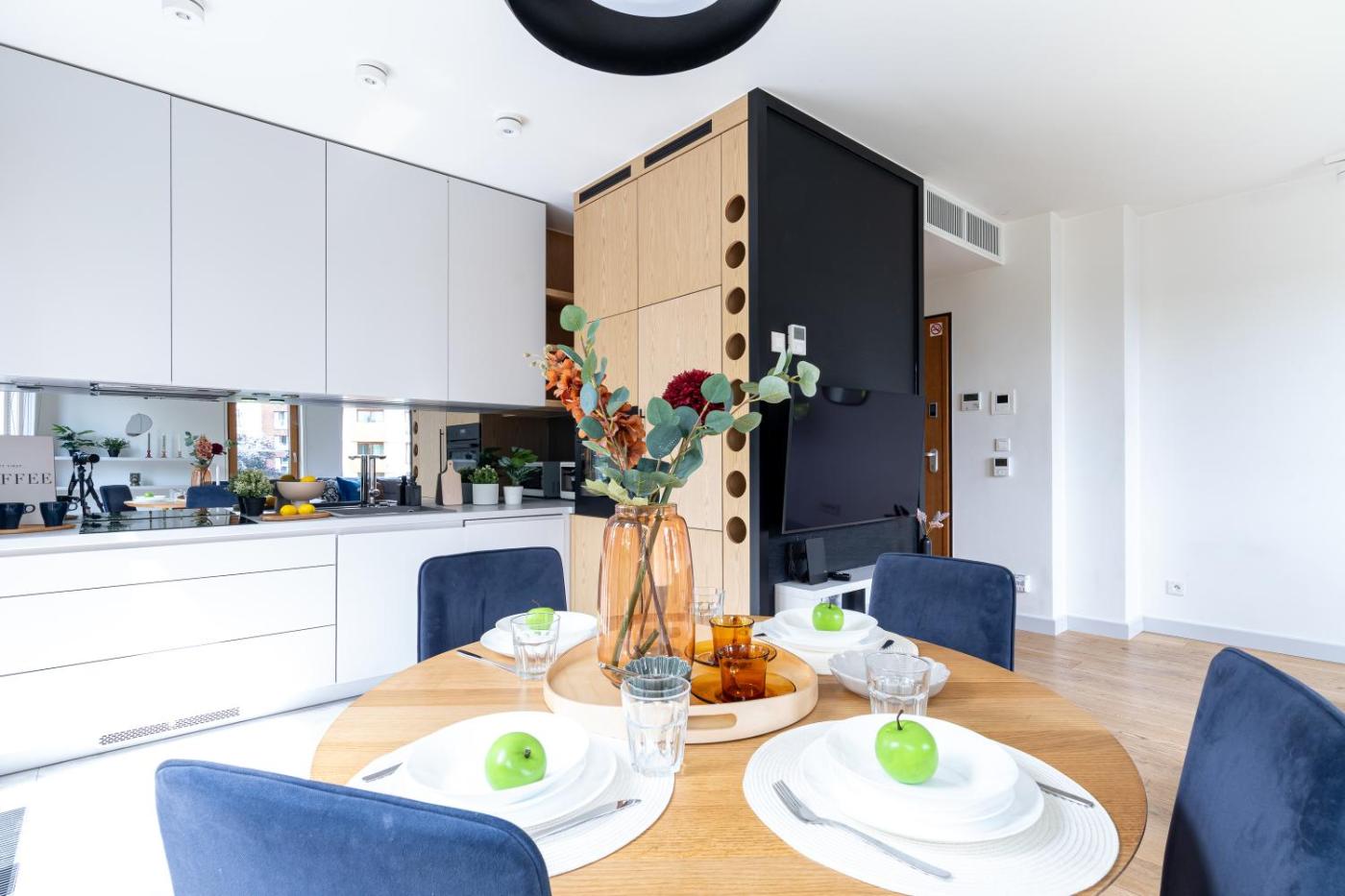 Oferta apartamentu obejmuje sypialnię (1), salon, aneks kuchenny z pełnym wyposażeniem, w tym lodówką i ekspresem do kawy, a także łazienkę (1) z prysznicem oraz suszarką do włosów. W apartamencie zapewniono ręczniki i pościel.